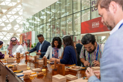 Supported by the Ministry of Commerce, The Institue's participation in "GREAT FUTURES" includes several accompanying activities such as an interactive woodworking art workshop (Najdi doors) that encourages the practice of traditional arts, as well as live demonstrations of Sadu weaving, and the display of various community art pieces created by different segments of society.